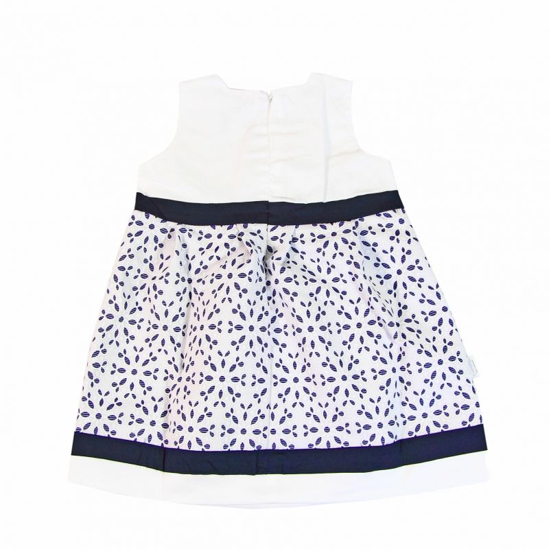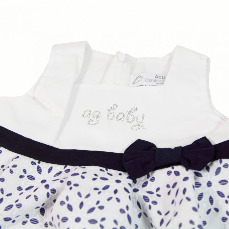 Роклята е изработена от мека памучна материя с елегантна бродерия в черно и бяло, кройката е свободна и разкроена от свивката на ръкава надолу. Леката памучна подплата осигирява допълнителен комфорт при носене. Нежни бродерии на малки букети цветя, разпръснати по цялата пола придават свеж, романтичен вид на модела. Роклята е подходящ избор за всеки специален повод.
