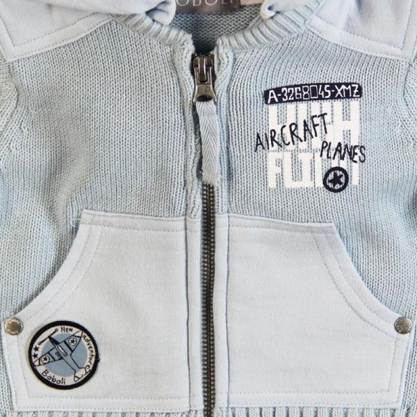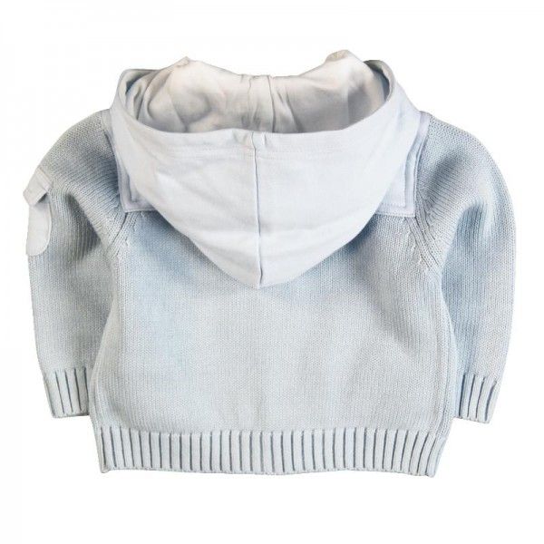 Бебешката жилетка е изработена от висококачествено памучно плетиво в нежен светлосин цвят. Дълбоката качулка е прикрепена към жилетката чрез малки копченца, като при необходимост може да се свали. Жилетката е богато украсена с различни по големина малки джобчета, тематична апликация и памучни платки на раменете.