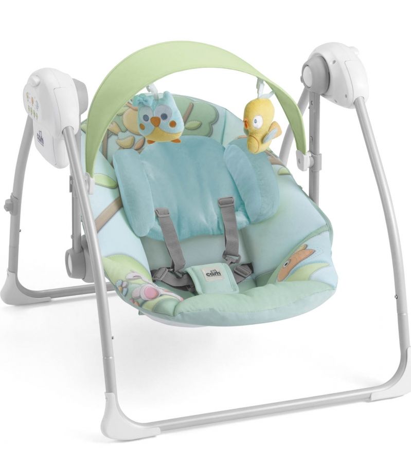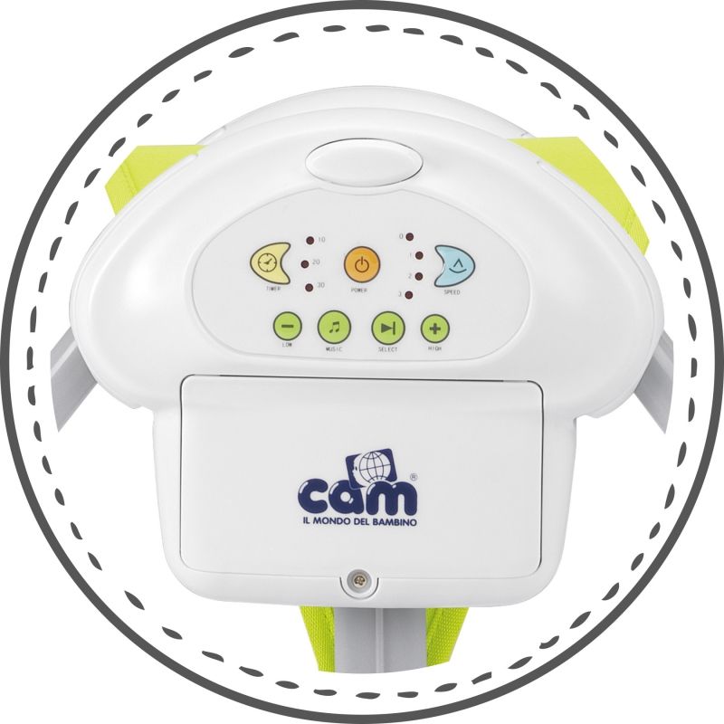 Бебешката люлка Sonnolento, Cam е подходяща за деца от 0 до 9 кг, има 2 положения на гръбчето, 3 скорости на люлеене, включени в комплекта 2 играчки, мелодии и звуци.
