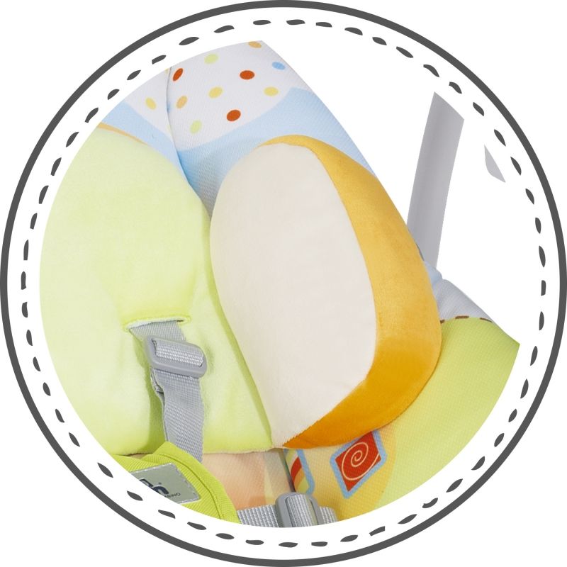 - Тапицерията е изработена от висококачествена материя, може да се сваля и пере при температура на водата 30 градуса и в комплекта е включена възглавничка за най-малките;