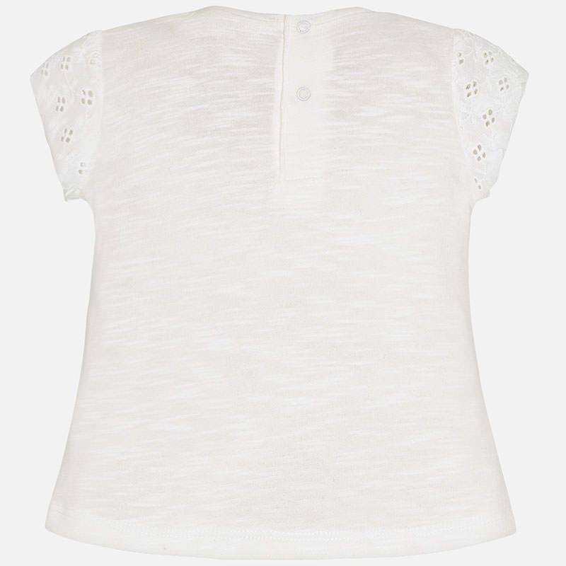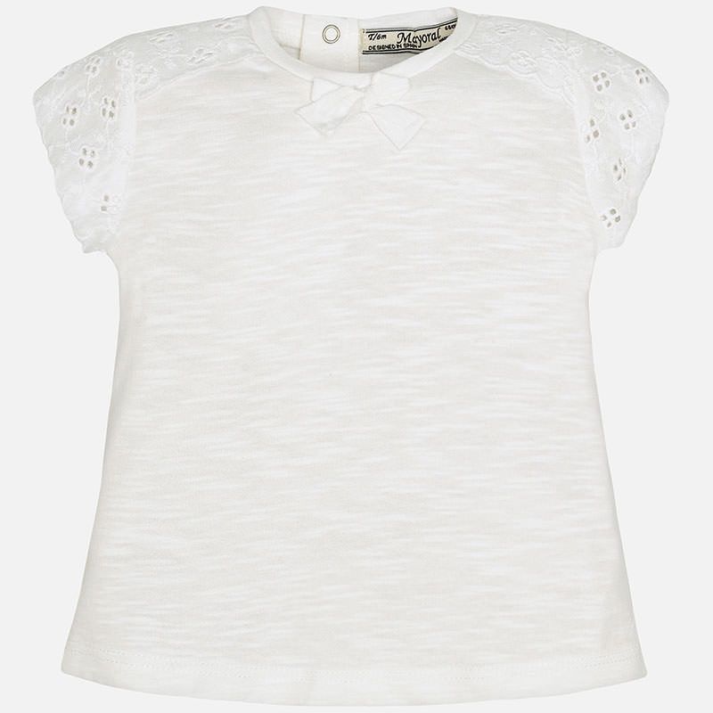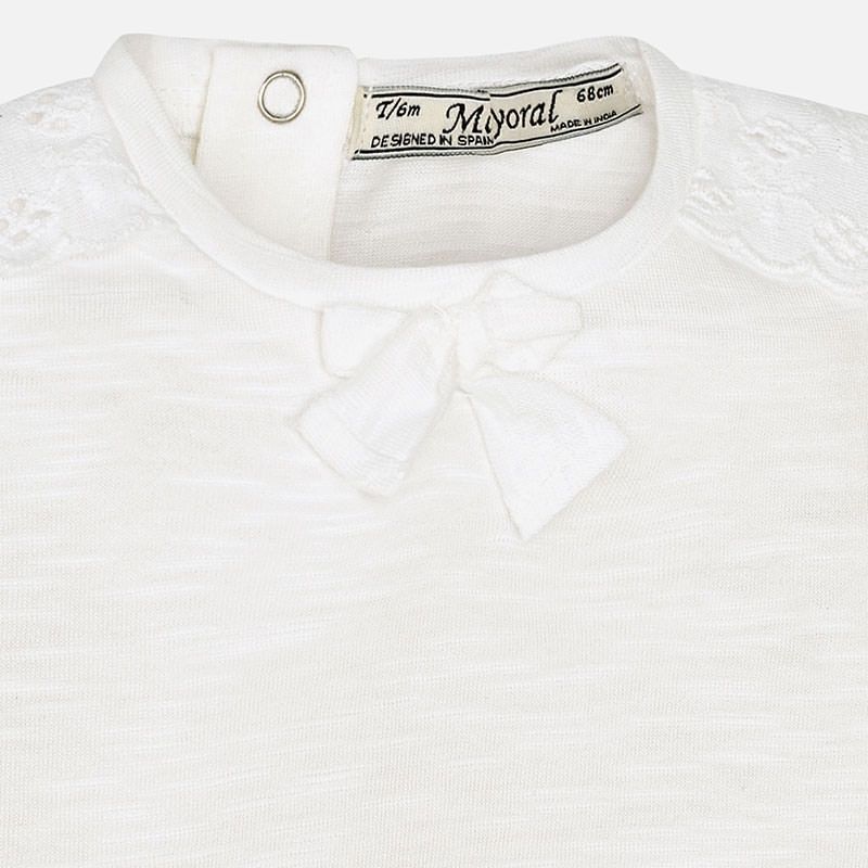 Бебешката блузка изцяло спазва концепцията на испанската фирма Mayoral да осигури на детето удобство, комфорт и не на последно място да изглежда изключително добре. Тя е изработена от висококачествен памук и това я прави много добър избор за горещите летни дни. Кройката и е свободна, а красивата дантела прекрасно допълват визията и.