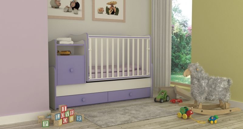 За допълнително удобство на родителите шкафът може да бъде монтиран отляво или отдясно на люлката, според пространството и разпределението на мебелите в стаята. Тои има повдигнати страници на плота за повиване, така че да е безопасен за детето и ракла с капак, вградена дръжка и механизъм за безшумно затваряне. Да се върнем на решетката, нейният нов дизайн позволява да демонтирате 2 от пръчките, така че детето само да излиза и влиза в кошарката, като в същото време да е обезопасено по време на сън. Самата решетка може да бъде махната изцяло, ако Вие и детето Ви прецените, че така леглото ще е по-удобно за него.<br />