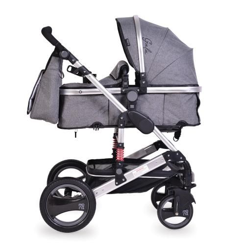 Детската количка на Мони Gala е направена, така че да бъде удобна за Вас и за Вашето детенце. Тя е с лека алуминиева рамка и компактни размери. Комфортът при возене е гарантиран от стабилните амортисьори, разположени на задната част на рамката и на предните колела. Позицията на коша се регулира чрез система от коланчета в седяща, полу-легнала и легнала, а за още по-голям комфорт към комплектът има и допълнителна подложка за седалката. Спирачната система е едноточкова за моментално спиране навсякъде.